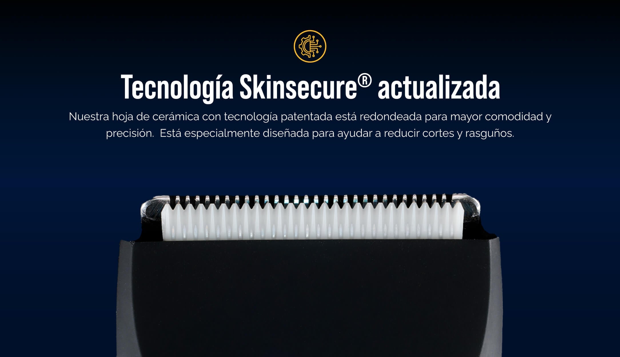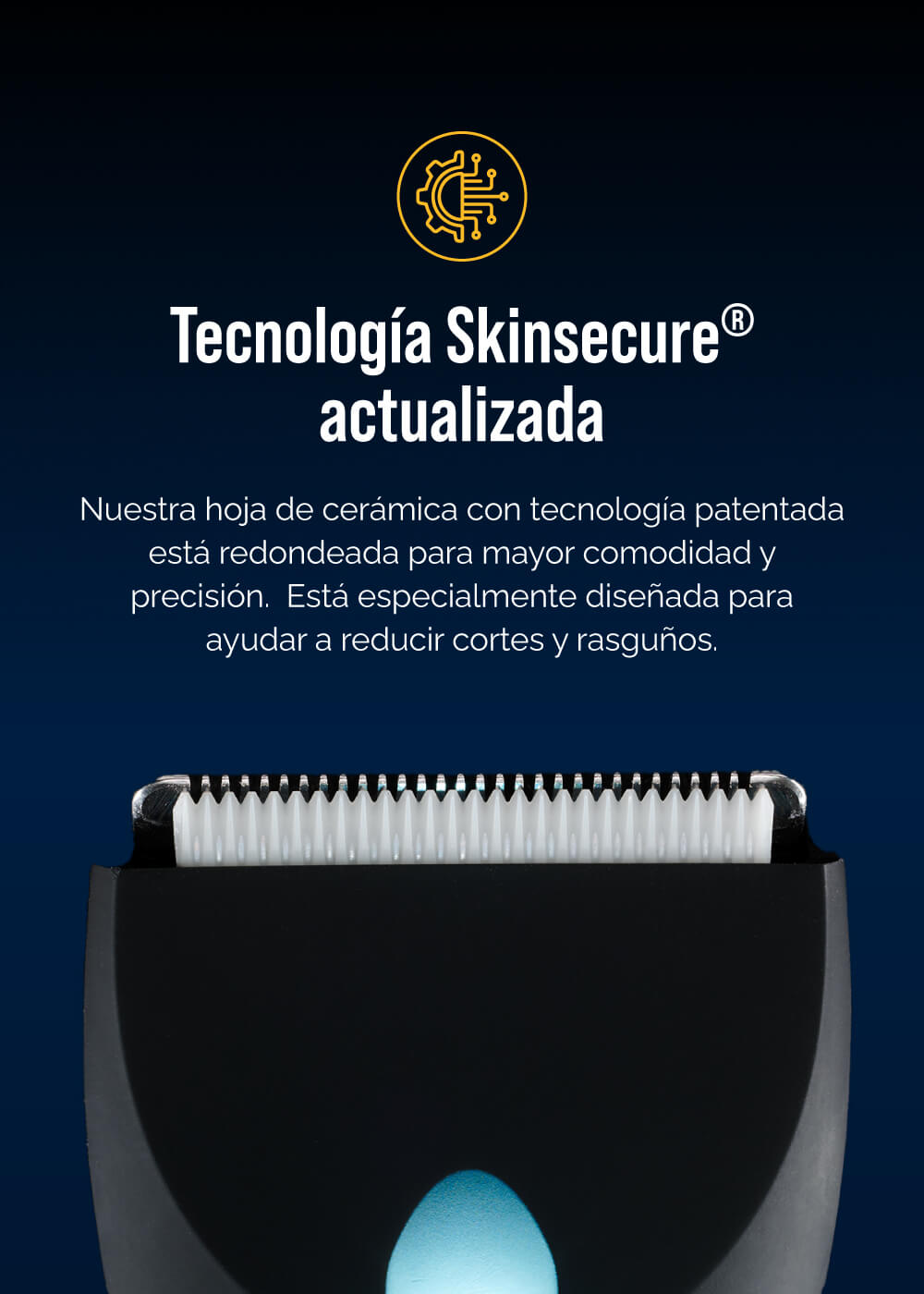 Nuestra tecnología SkinSecure® cuida la piel al minimizar la fricción y las irritaciones durante el afeitado. Esto se logra gracias a las hojas de cerámica flexible diseñadas con precisión y a la tecnología de protección de la piel, lo que garantiza un afeitado suave y sin irritaciones si la usas de forma correcta.