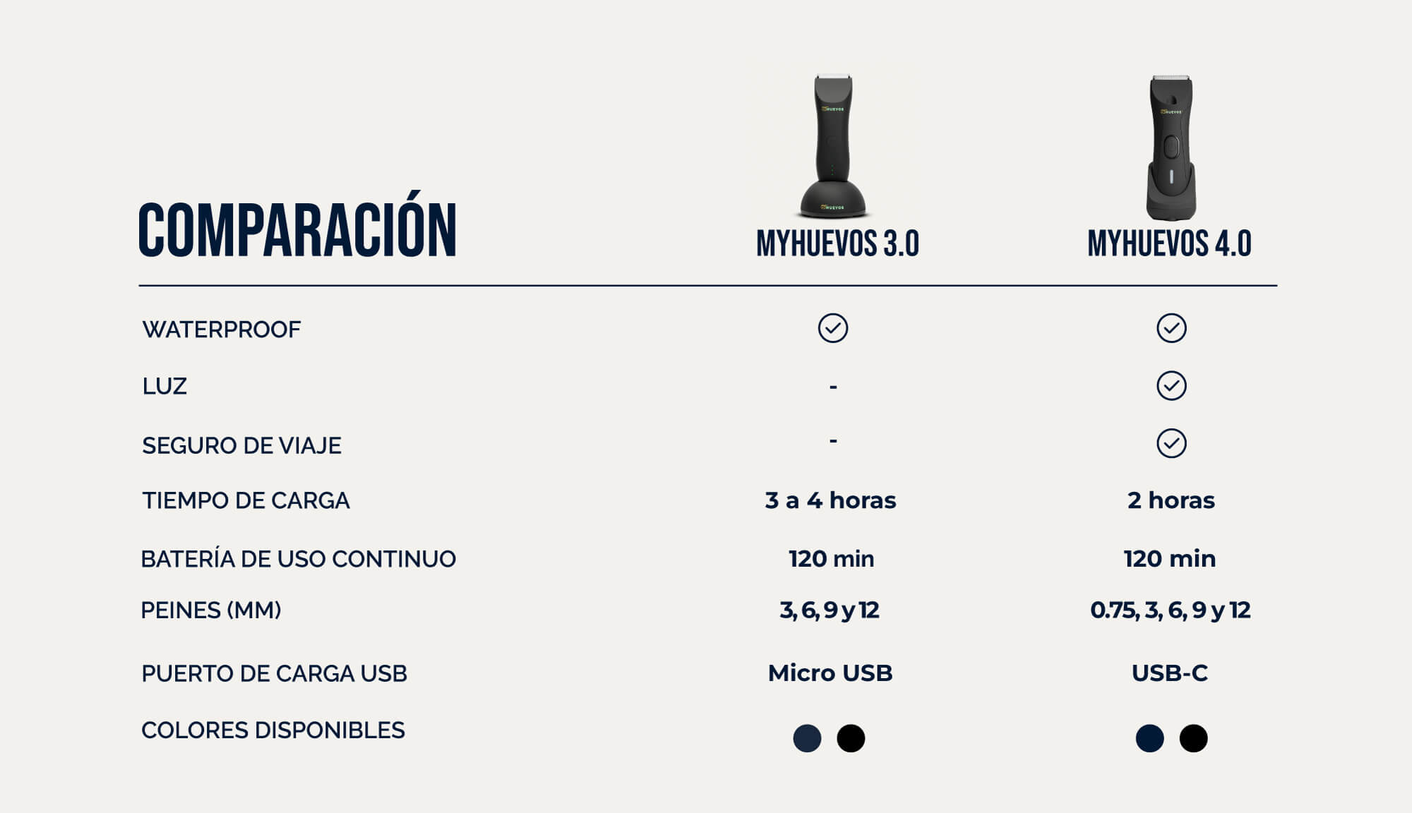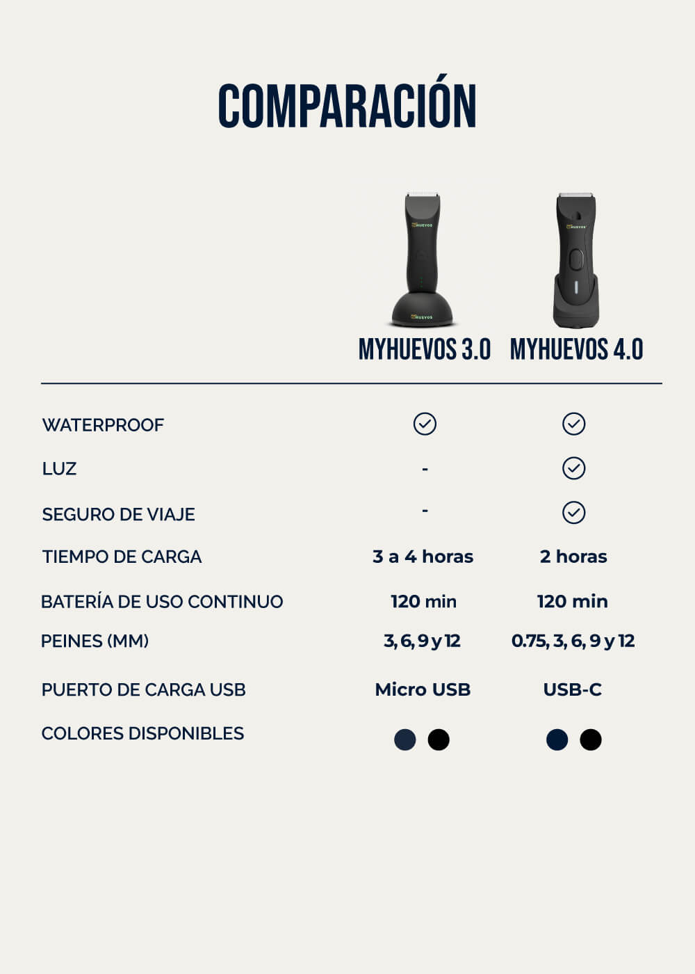La Rasuradora MyHUEVOS® 4.0 Pro viene con 4 longitudes de peines para rasurar, lo que te permite personalizar tu estilo de vello púbico, corporal o barba.